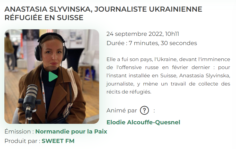 C’est d’ailleurs dans le cadre de la conférence « Tout savoir sur la guerre en Ukraine » que j’ai eu l’occasion d’interpréter Anastasia Slyvinska, journaliste ukrainienne. En parallèle de la conférence, Anastasia a également fait un passage à la radio, sur Sweet FM, dans laquelle elle revient sur les événements du 24 février 2022 qui ont chamboulé sa vie, ainsi que sur son travail de collecte de récits de réfugiés.